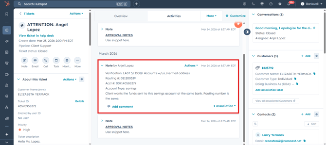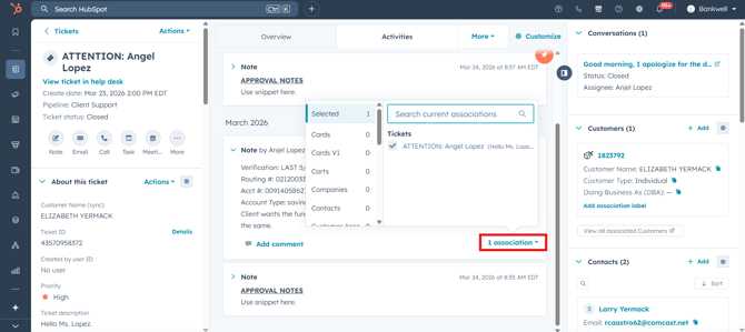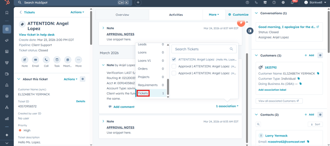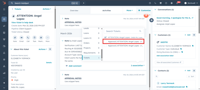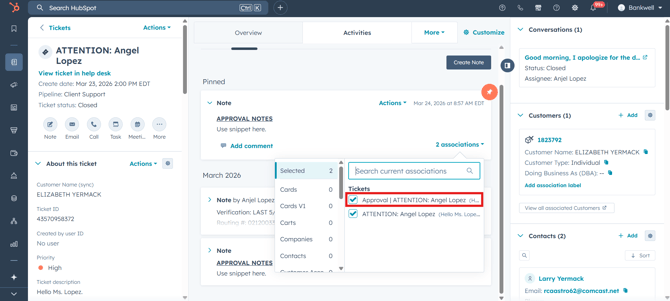 The association is instantly created. If you navigate to the second ticket, you will now see the internal approval note directly on its timeline.
